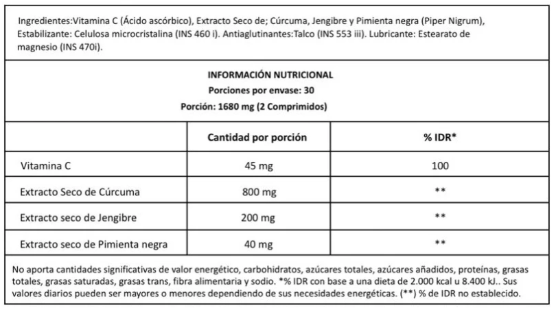Colágeno hidrolizado con ácido hialurónico, biotina (vitamina B7), L-cisteína y vitamina C, combinado con extracto seco de cúrcuma, jengibre y pimienta negra.
