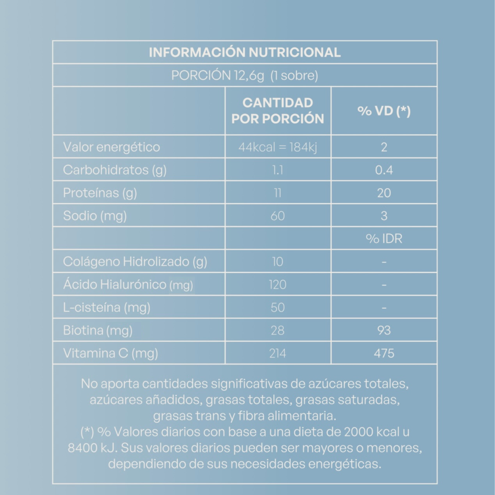 Su combinación de ingredientes ayuda a mejorar la vitalidad y firmeza de la piel, fortalece el cabello y las uñas, y acompaña el cuidado de las articulaciones como parte de una rutina diaria.
